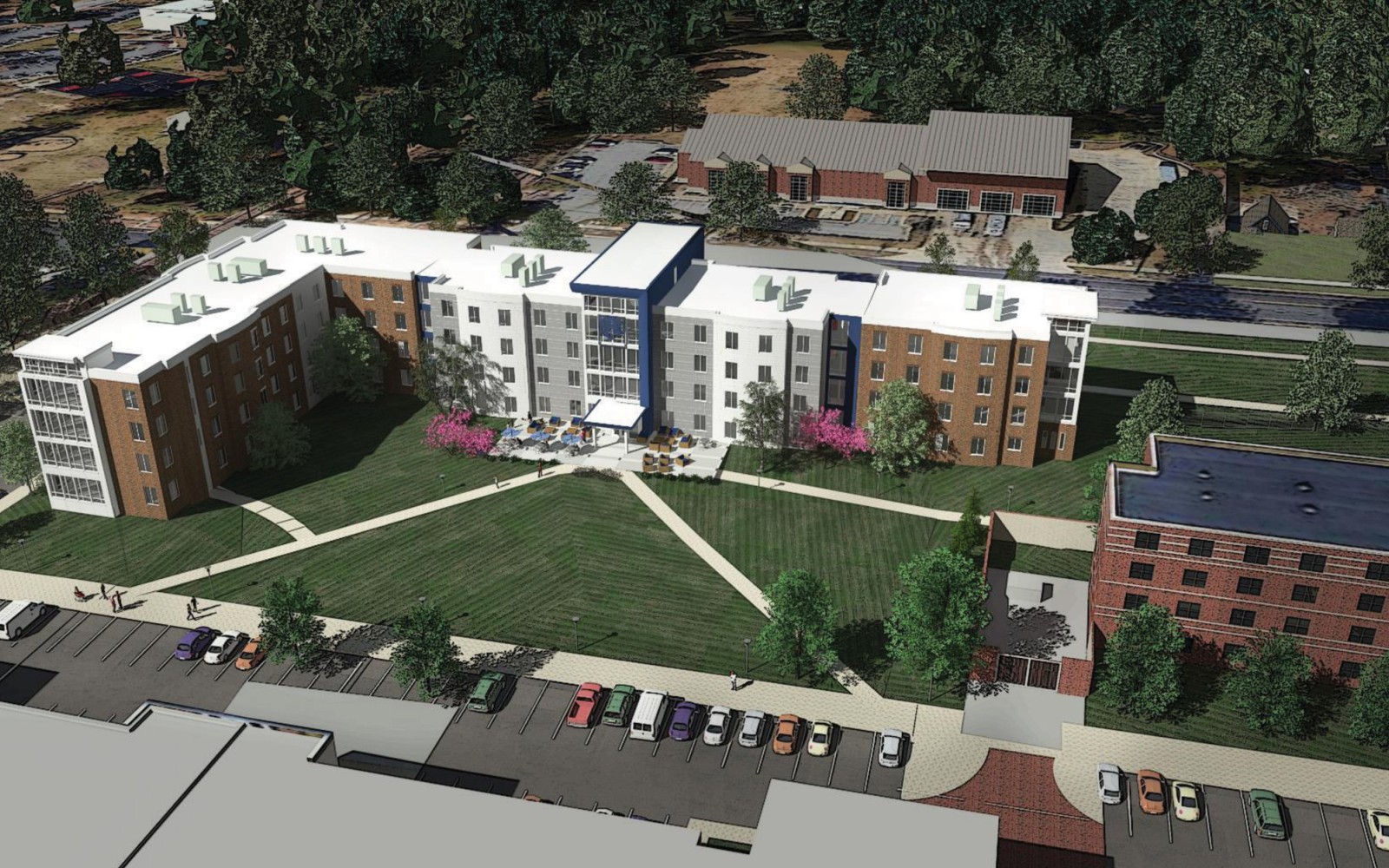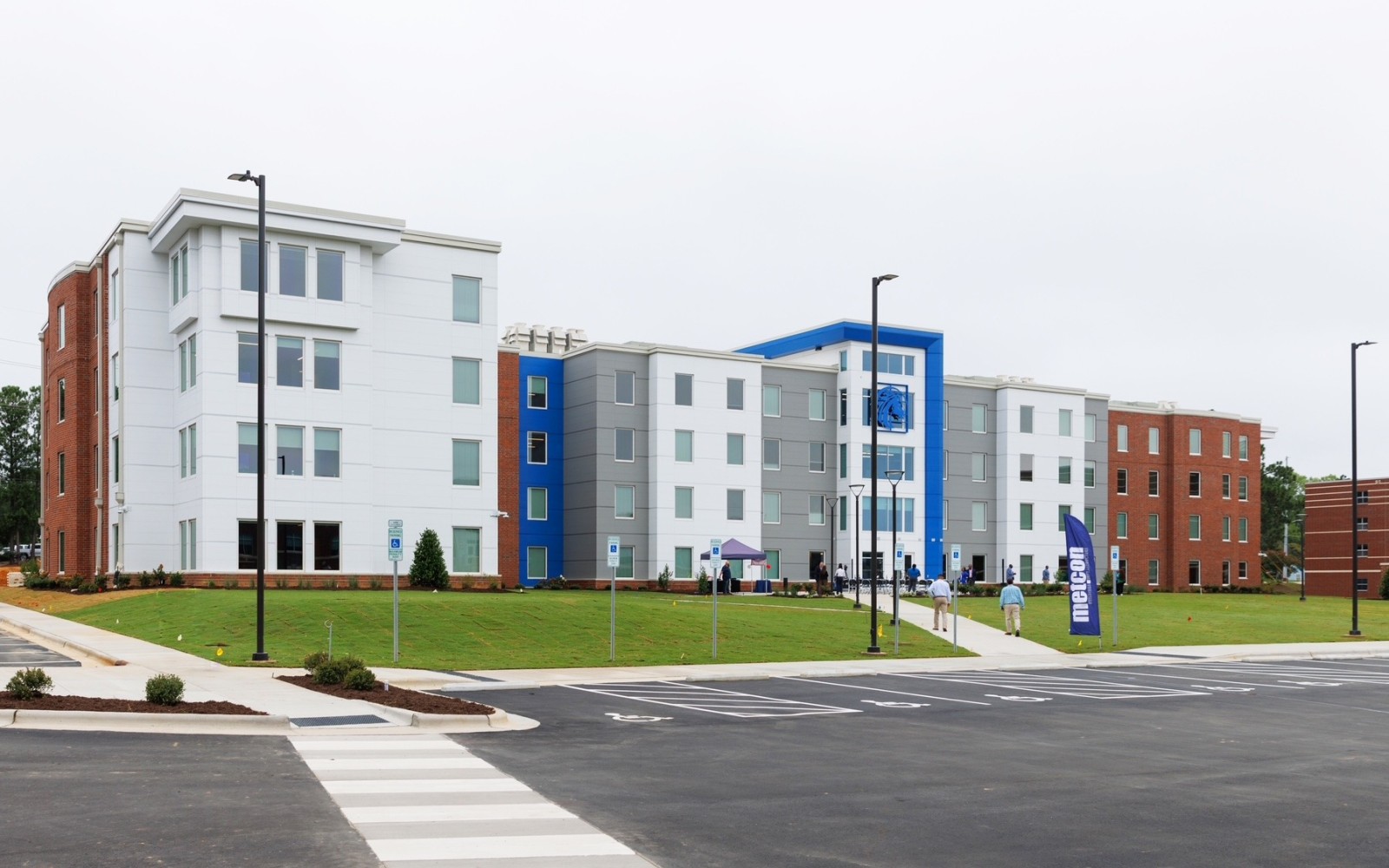 The new, 88,000 SF Bronco Pride Hall project was completed on the university's East Campus, on a site once occupied by Vance Hall, which was demolished. The building's L-shape responds to the site constraints and maximizes the grassy area on the south side of the building to provide outdoor amenities for students.