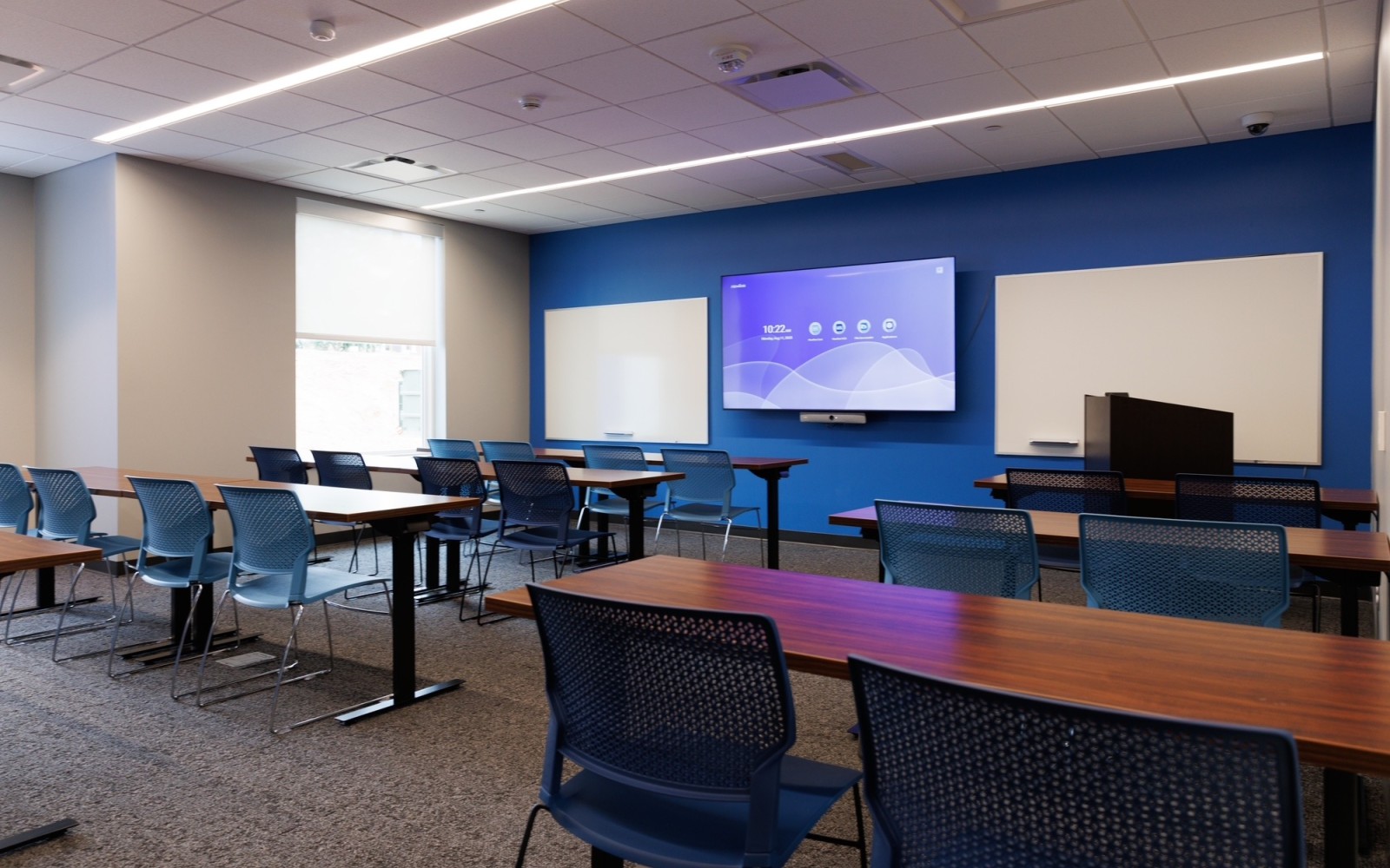 The spirit of the university is reflected on the outside of the building, as well as on every floor. The new residence hall's interior palette uses a clean and crisp take on the FSU "Blue Blood" school color, creating a consistent look and feel throughout the building.