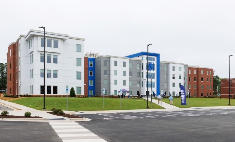 The residence hall is the first new housing facility on campus and is designed for freshman and sophomores. The hall features 19, 37-resident houses with a mix of traditional single and double occupancy rooms and small community bathrooms.